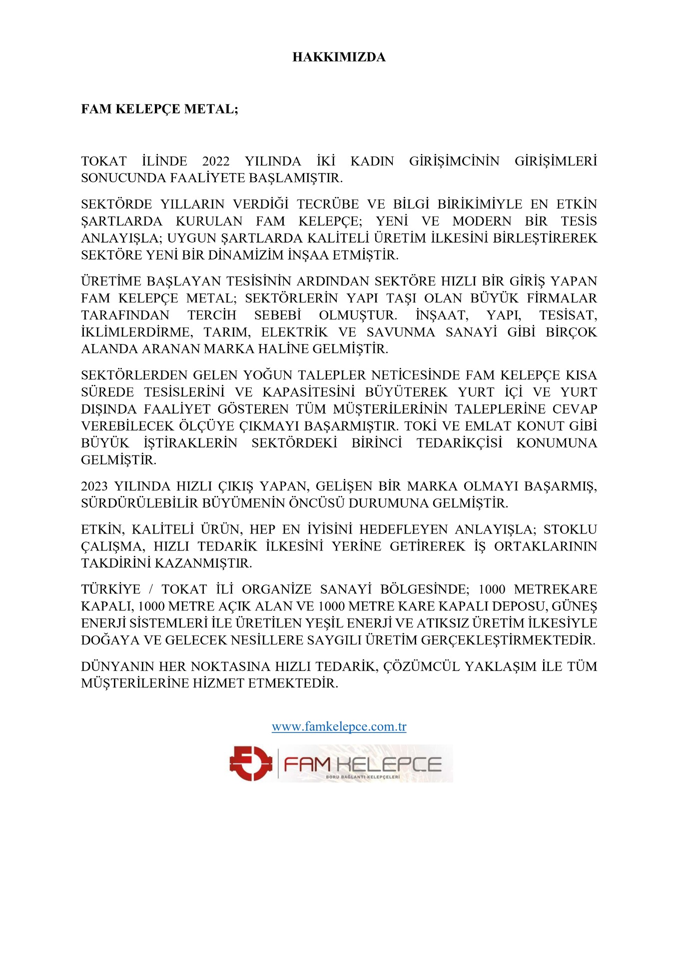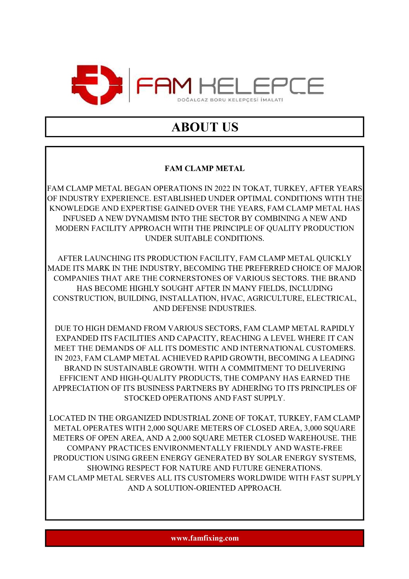LOCATED IN THE ORGANIZED INDUSTRIAL ZONE OF TOKAT, TURKEY, FAM CLAMP METAL OPERATES WITH 2,000 SQUARE METERS OF CLOSED AREA, 3,000 SQUARE METERS OF OPEN AREA, AND A 2,000 SQUARE METER CLOSED WAREHOUSE. THE COMPANY PRACTICES ENVIRONMENTALLY FRIENDLY AND WASTE-FREE PRODUCTION USING GREEN ENERGY GENERATED BY SOLAR ENERGY SYSTEMS, SHOWING RESPECT FOR NATURE AND FUTURE GENERATIONS.